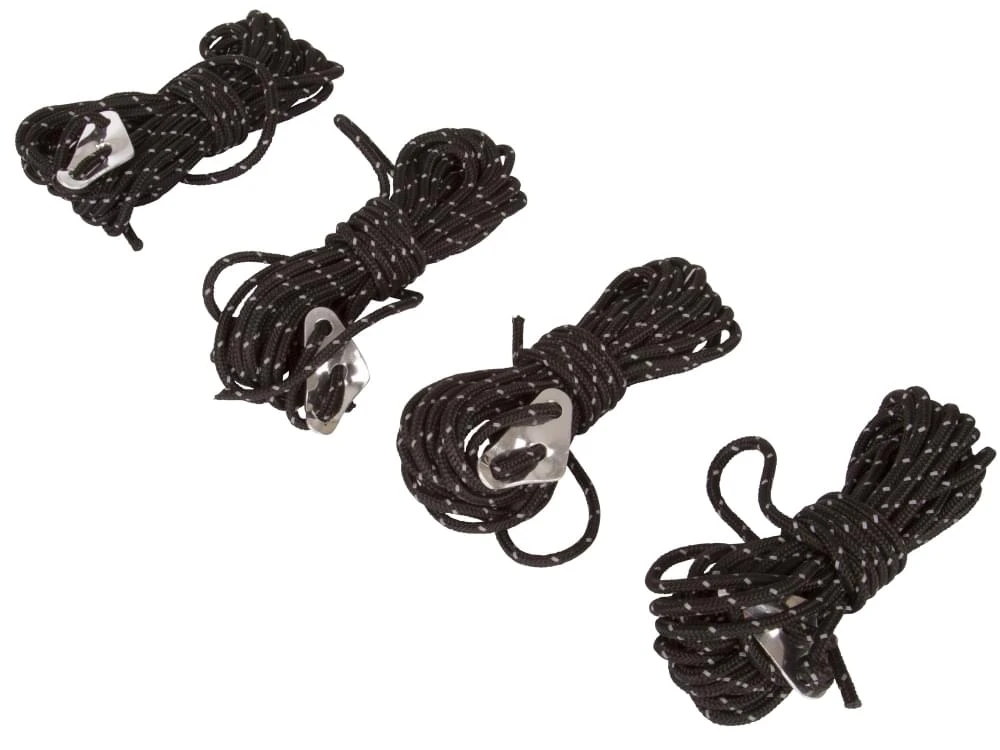 De Prestige Scheerlijnenset bestaat uit een set van 4 scheerlijnen van elk 4 meter lengte. Deze zijn extra opvallend gemaakt door de reflecterende details die oplichten, wanneer je er met de zaklamp op schijnt. De aluminium spanners zorgen ervoor dat je de scheerlijnen snel kunt afspannen en blijven goed op hun plaats.