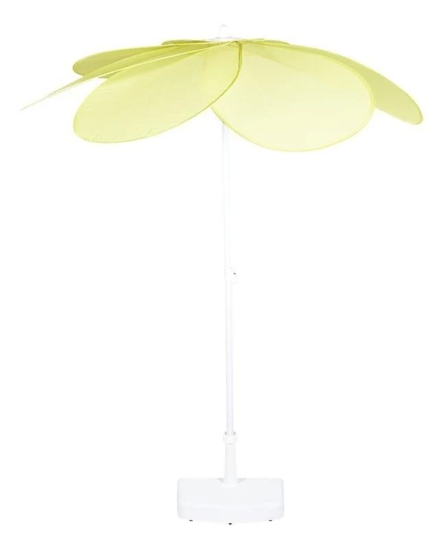 Leuke kinderparasol in de vorm van een bloem. De bloemblaadjes (nylon doek) vouw je open en vervolgens maak je de blaadjes bovenaan elkaar vast. De laatste stap ik het bevestigen van het doek op de parasolmast. De mast komt in twee delen en de set kan in zijn geheel opgeborgen worden in de meegeleverde opbergzak.