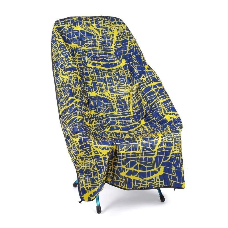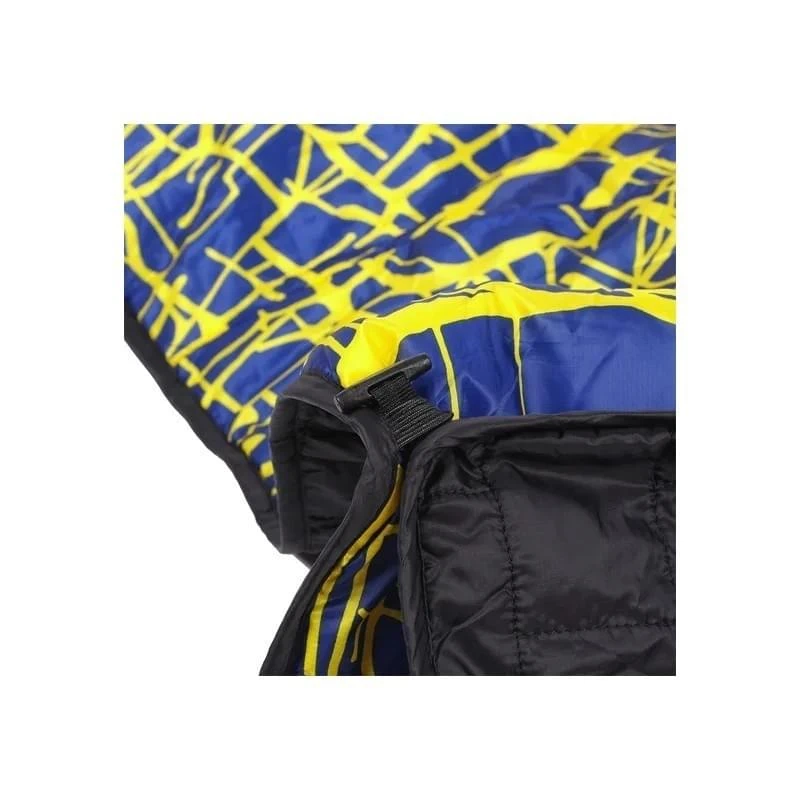 De Bloncho van Helinox is eigenlijk een deken en poncho in een. Dankzij de opening voor de nek kan je de deken als poncho dragen zodat je, wanneer je aan de wandel gaat, je handen vrij hebt. Je kan de Bloncho door middel van drukknopen inkorten, zo sleept hij niet over de grond als je gaat staan of lopen. De ponchodeken is gemaakt van 100% polyester en is reversible. De ene kant heeft een vrolijke blauw-gele print, de andere kant is effen zwart.