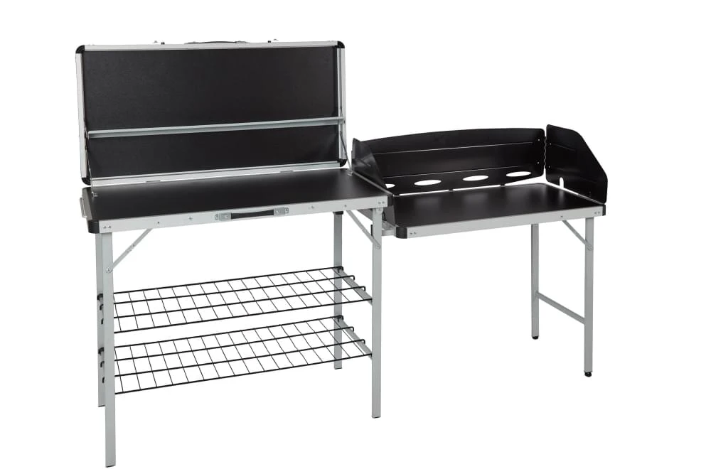 Zo heeft deze opvouwbare keuken een zijtafel met windscherm waar je het gasstel kwijt kan. Ook zitten er 2 rekken onder het hoofdblok van de keuken waar je al je campingpannnen kwijt kunt. Aan de haken kan je je attributen kwijt, denk dan aan bijvoorbeeld een bakspaan, pollepel enzovoort. Er is zelfs aan een kruidenrek gedacht! Handig is ook dat de poten verstelbaar zijn.