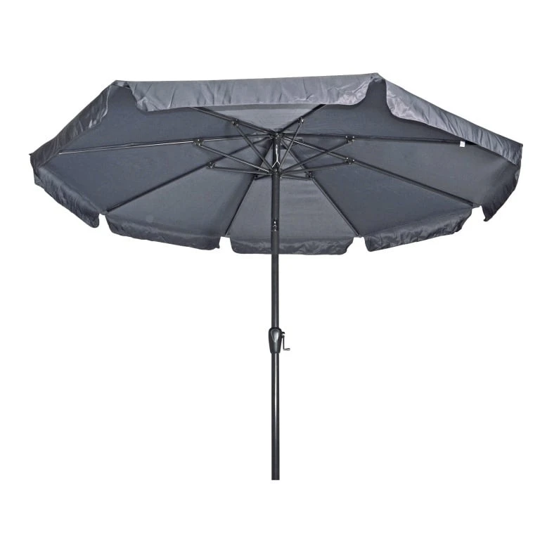 De parasol heeft een veersysteem, 8 baleinen en antraciet kleurig aluminium frame met molen waardoor deze grote jongen makkelijk op te zeten is.