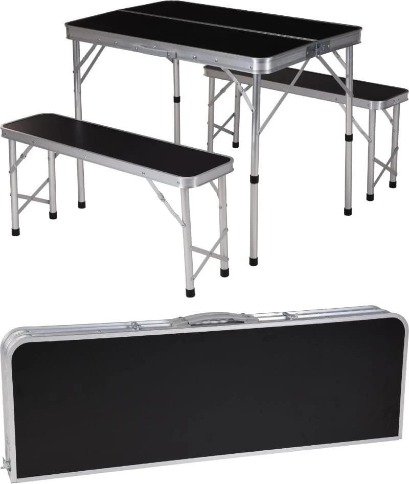 Deze aluminium picknickset bestaat uit twee losse bankjes en een tafel. De tafel is ingeklapt gelijk de koffer waar de ingeklapte bankjes inpassen. Aan de tafel zitten handgrepen zodat je de “koffer” ook makkelijk kunt dragen.
